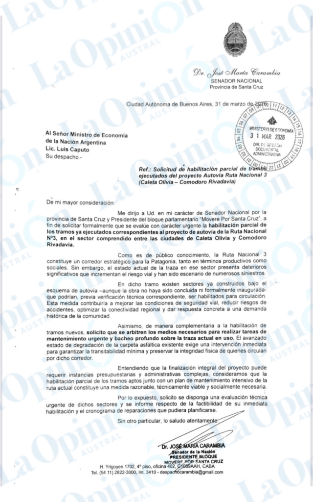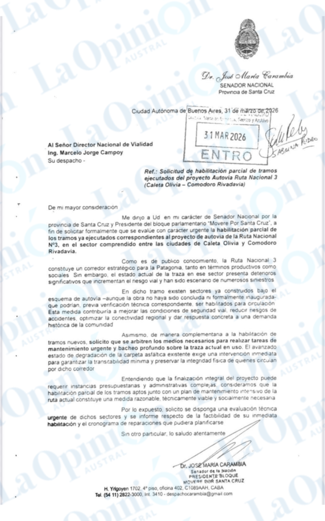 El senador nacional por Santa Cruz, José María Carambia, presentó un pedido formal ante el Ministerio de Economía de la Nación y la Dirección Nacional de Vialidad para que se evalúe con carácter urgente la habilitación parcial de los sectores ya ejecutados de la autovía sobre la Ruta Nacional N° 3, en el tramo que conecta Caleta Olivia con Comodoro Rivadavia.
