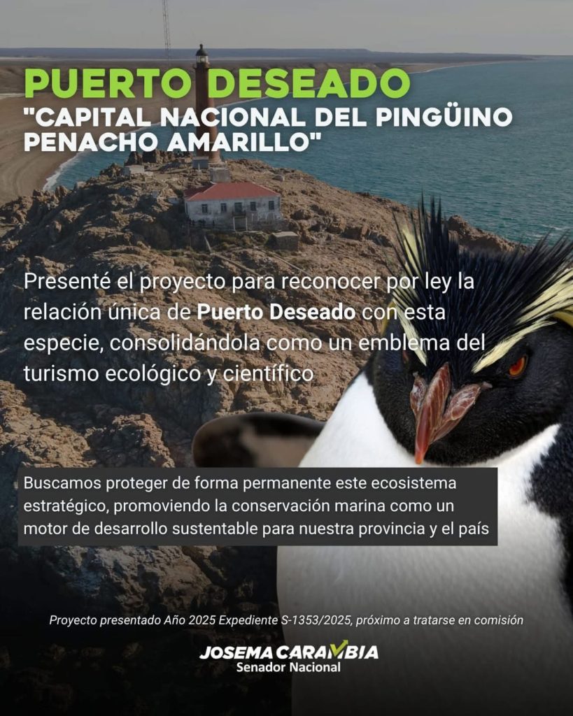 En segundo lugar, la iniciativa plantea designar a Puerto Deseado como Capital Nacional del Pingüino de Penacho Amarillo, poniendo en valor su relevancia en la conservación de esta especie y su riqueza ambiental dentro del ecosistema patagónico.